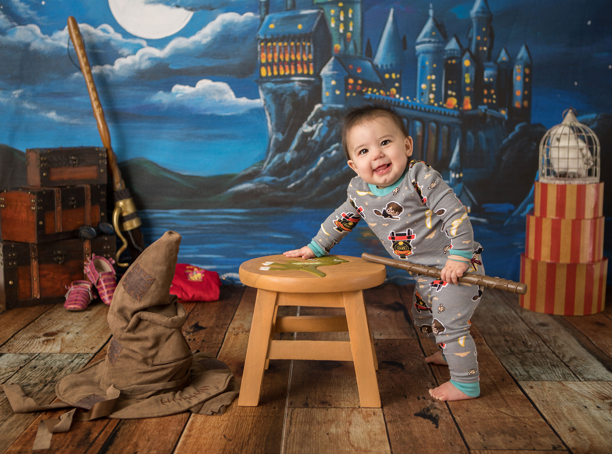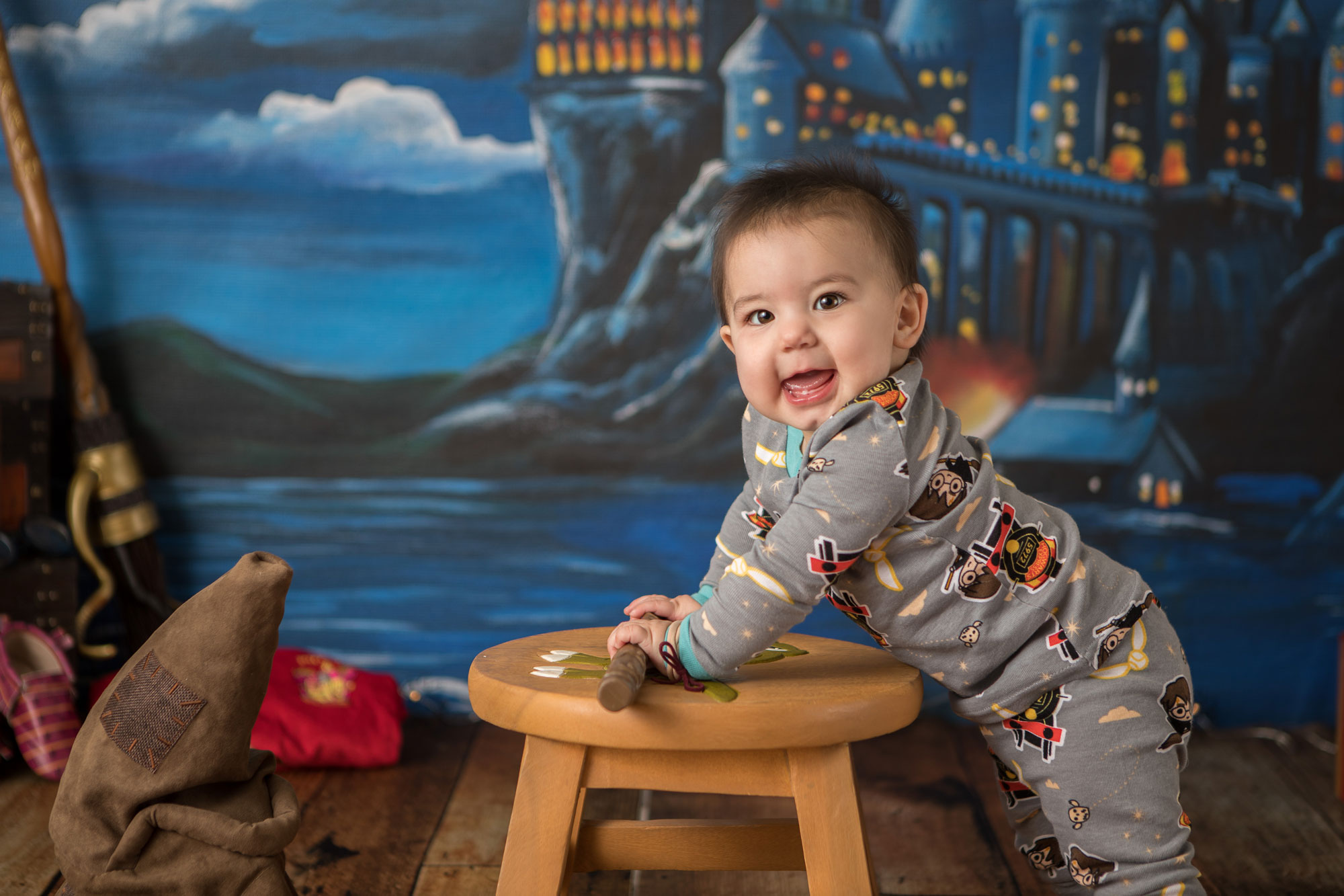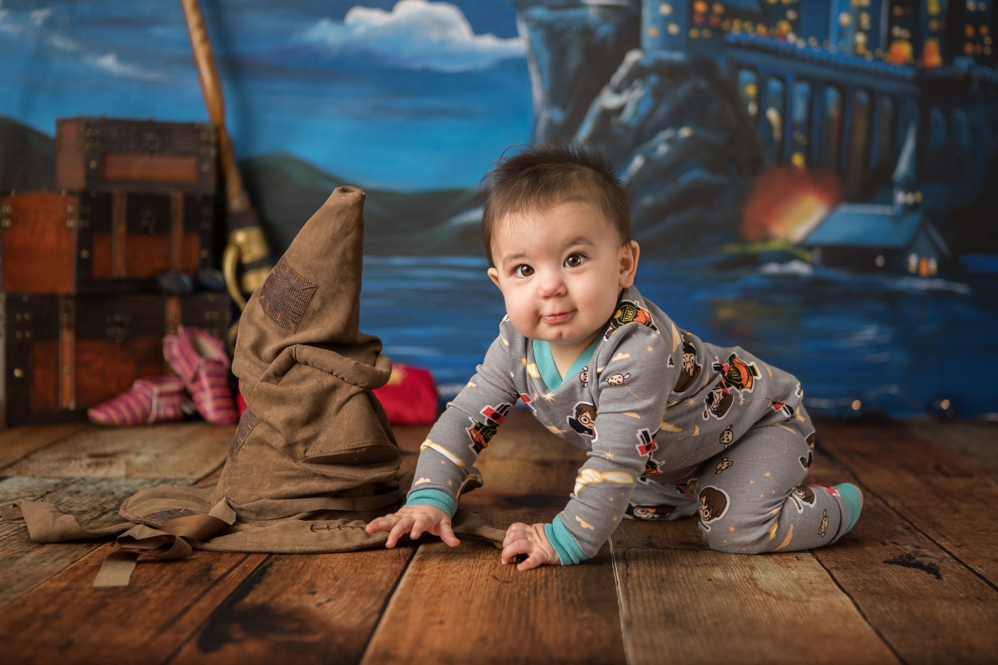 We’re having so much fun with these sessions! Little sis is about to hit her big 9 3/4 months old milestone so themed photos were in order! She has two older sisters that have a Harry Potter themed room…so of course photos to go with their room were needed!