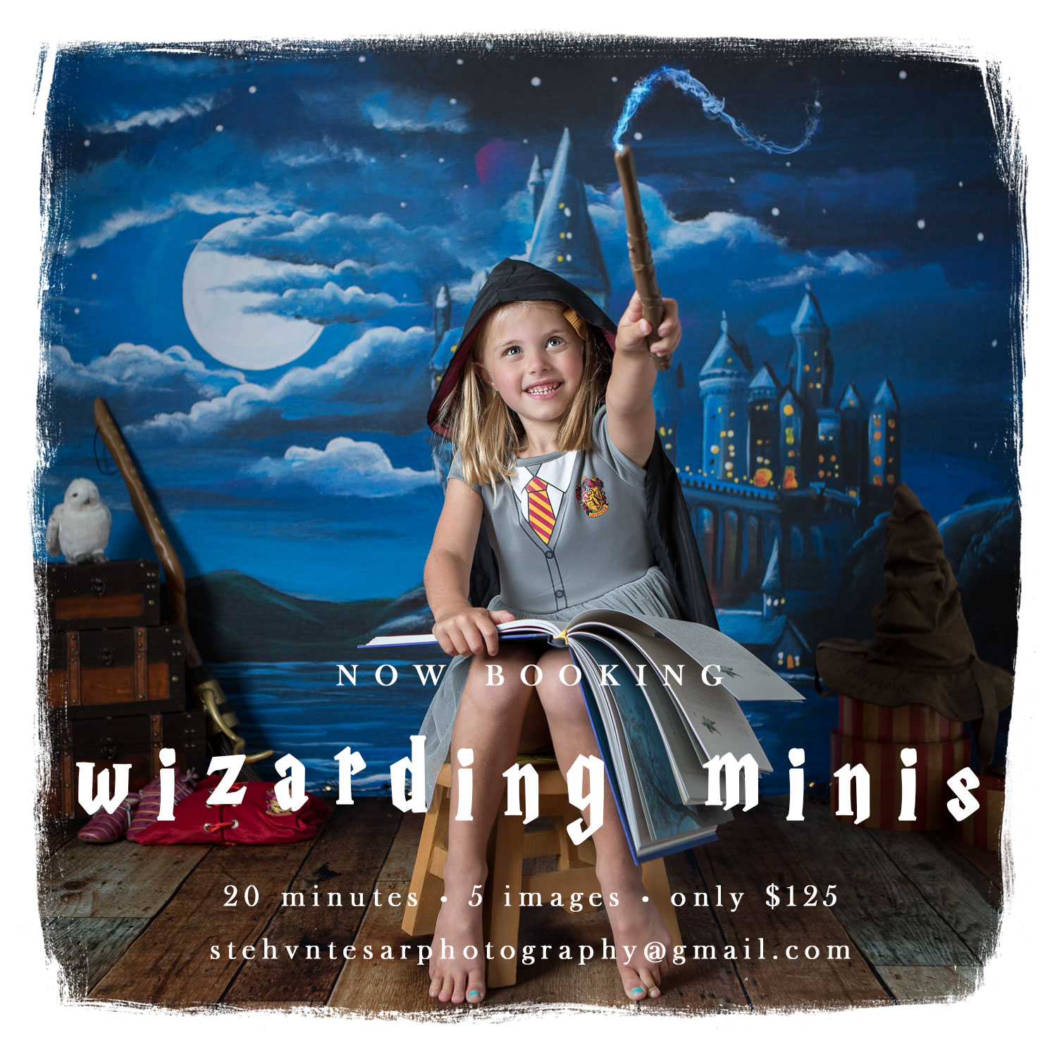 Whether your little one is expecting a back to school letter to wizard school or just ready to get into the Halloween spirit with a fun session a bit early this year…these minis are for you! Each mini session will last approximately 20 minutes. Bring/wear your own costumes or props or use what we have… Continue reading Wizarding Studio Minis